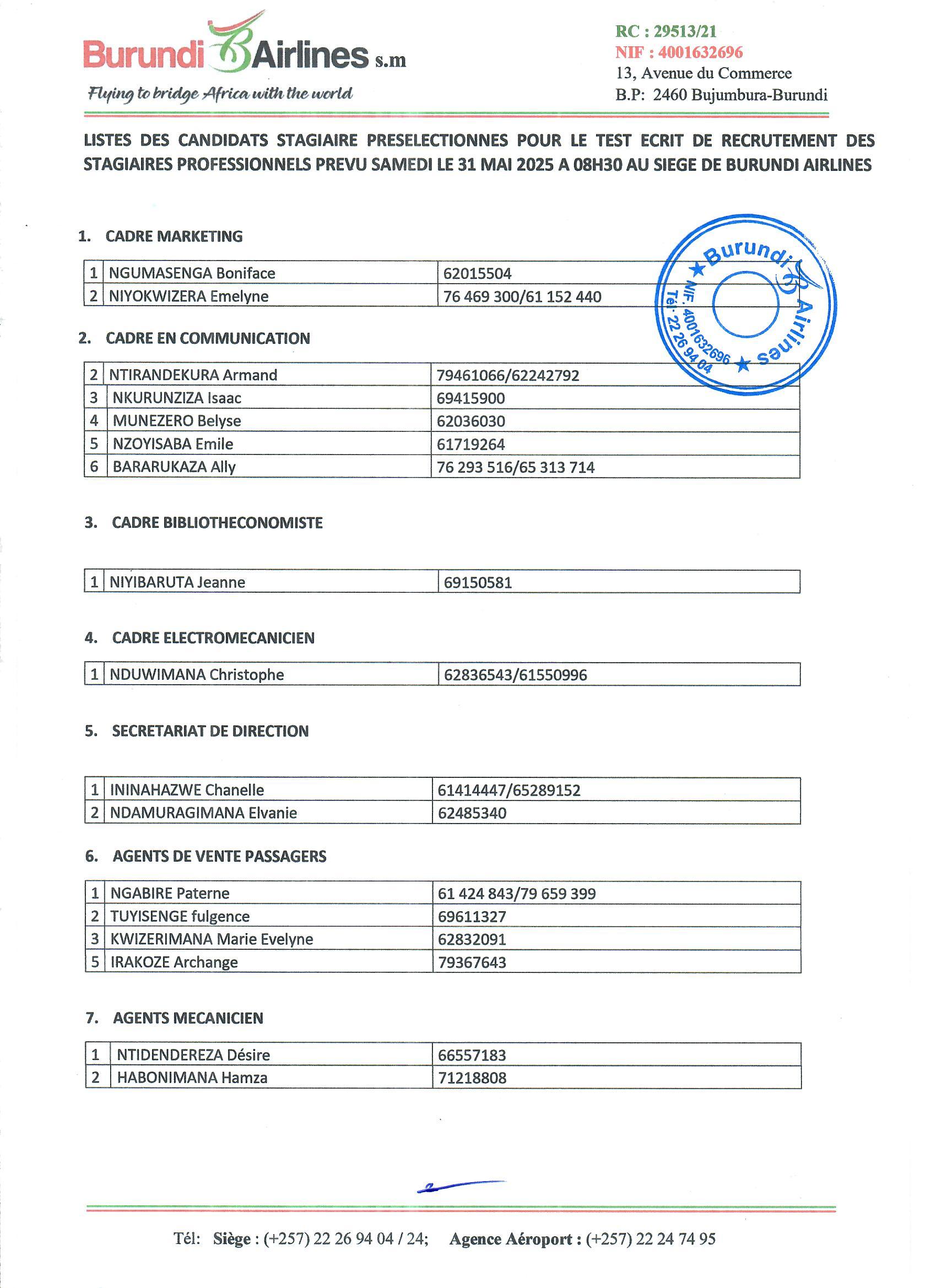 Voici la liste des candidats stagiaires présélectionnés qui sont invités à passer le test écrit de recrutement des stagiaires professionnels prévu pour Samedi, le 31 Mai 2025 à 08h30 au siège de Burundi Airlines, sise à Rohero I, Avenue du Commerce N° 13.