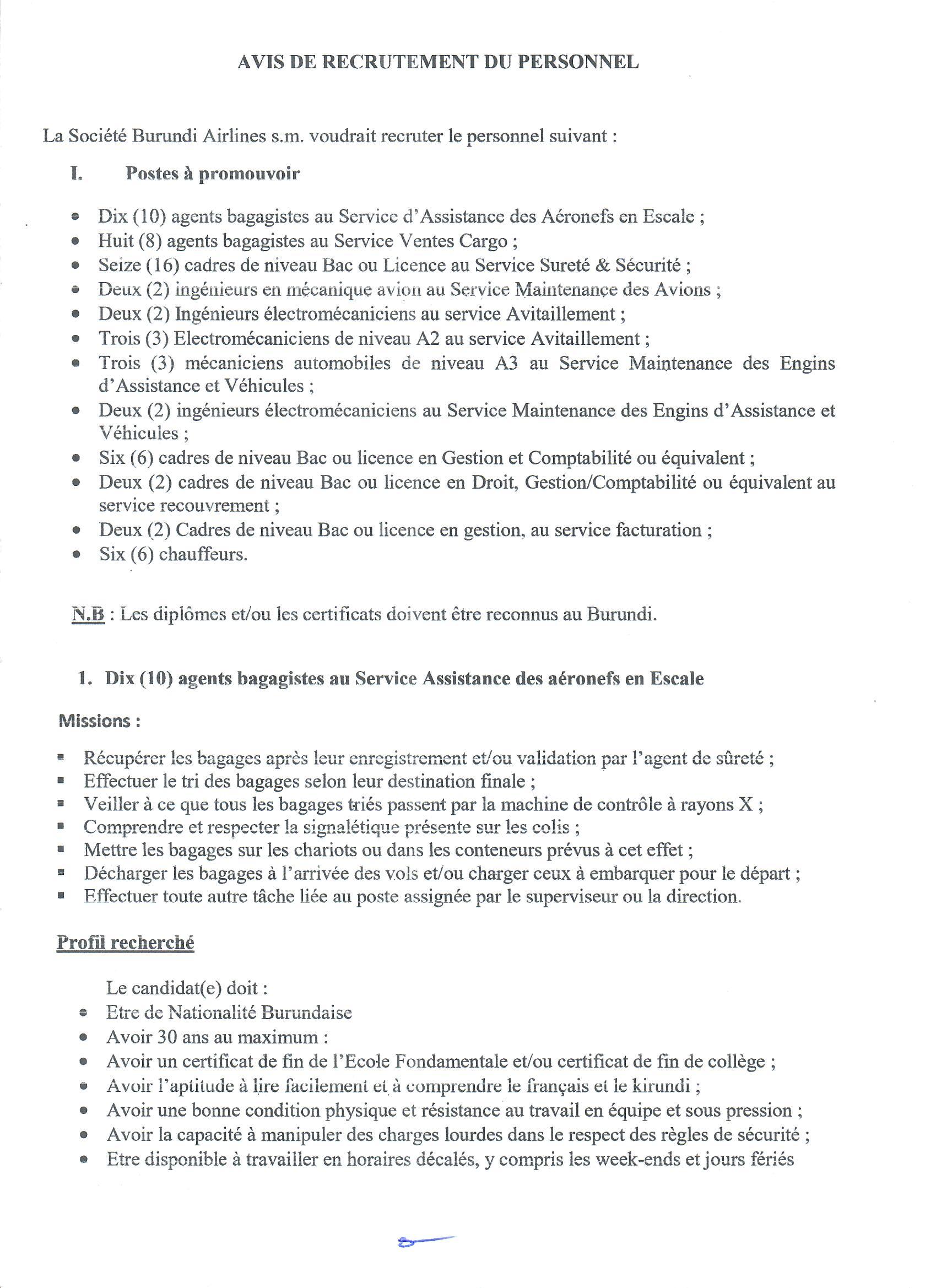 Burundi Airlines est engagée dans l’exécution des différents processus liés à l’assistance des passagers, au traitement des bagages, aux opérations de chargement et de déchargement des marchandises à bord des aéronefs, ainsi qu’à toutes les activités directement ou indirectement liées au transport aérien. Ces opérations sont menées dans le strict respect des standards internationaux de sécurité et de qualité. La réussite de cet engagement repose en grande partie sur la disponibilité de ressources humaines adéquates, tant en quantité qu’en qualité. À cet effet, la présence d’un personnel intègre, compétent et disposant de connaissances techniques avérées constitue un facteur essentiel pour atteindre les objectifs fixés par la compagnie.