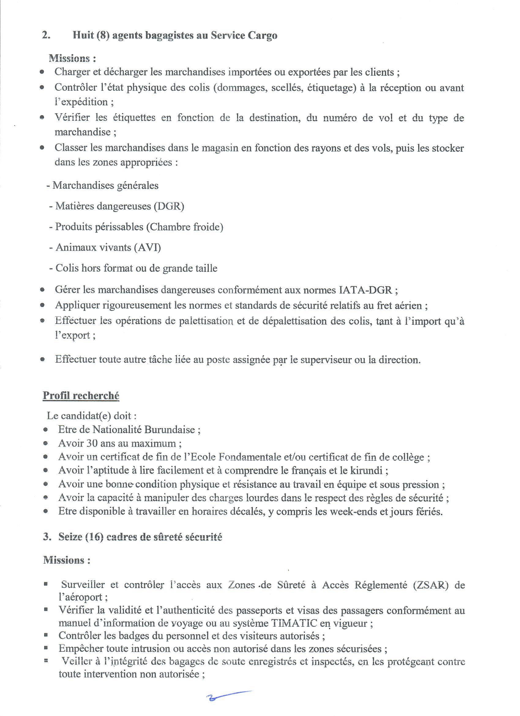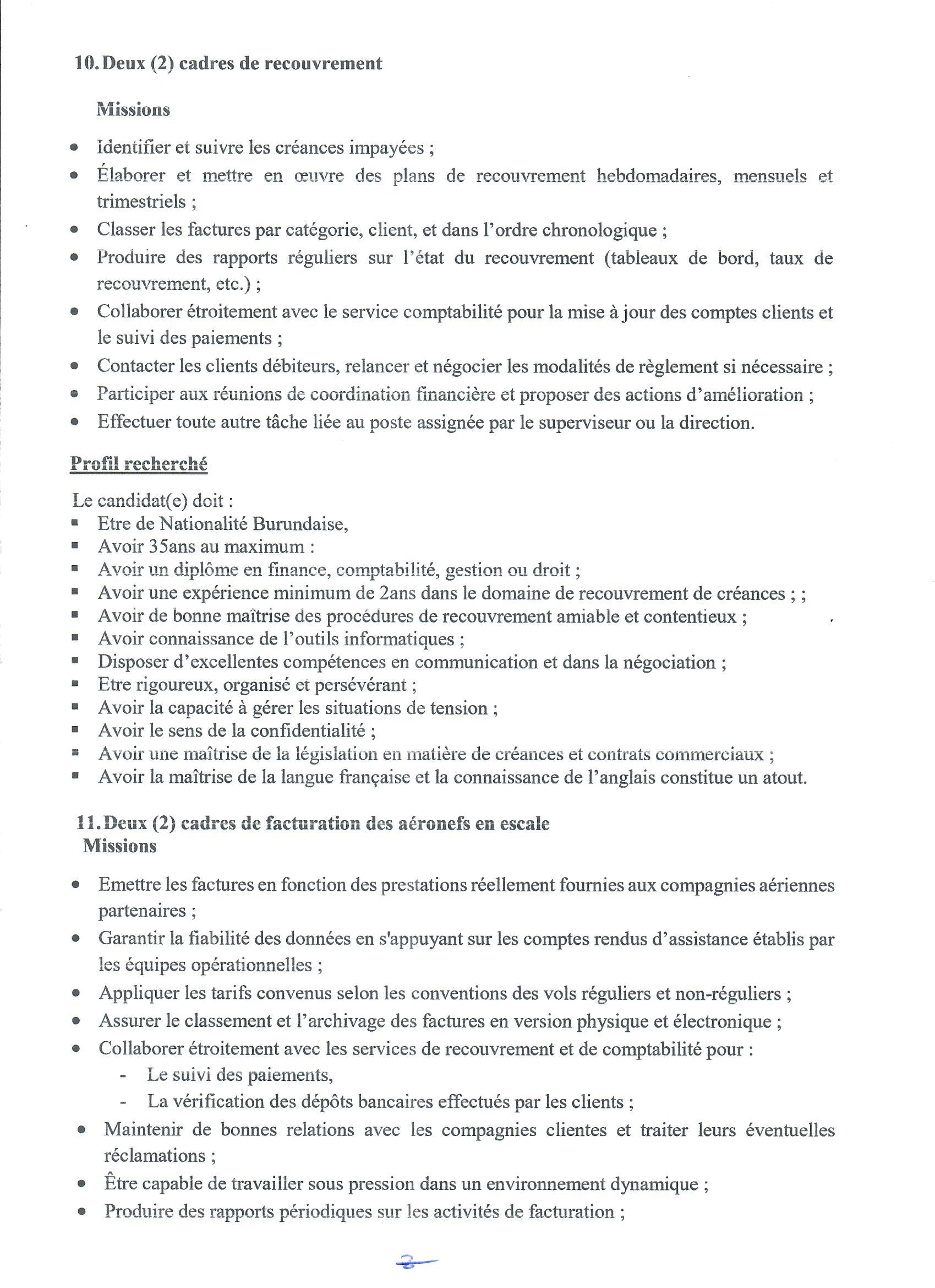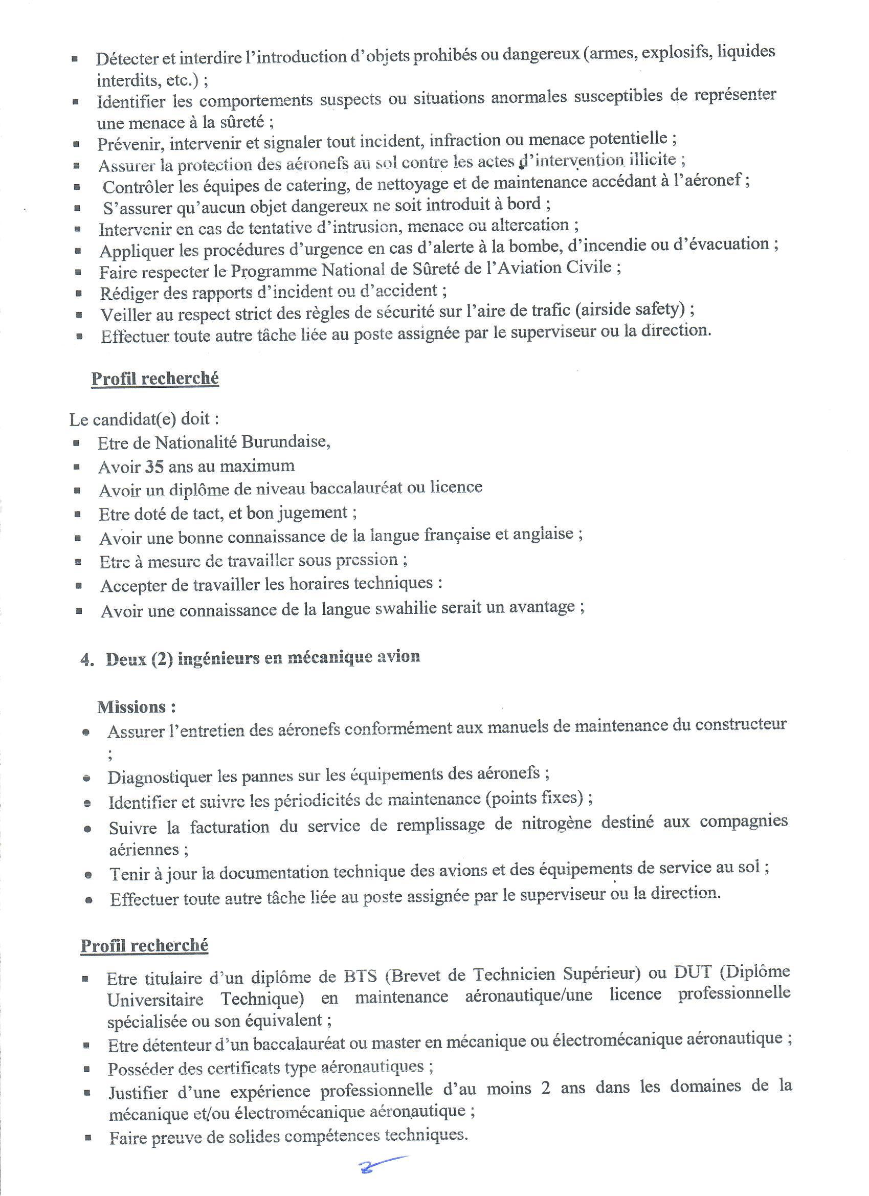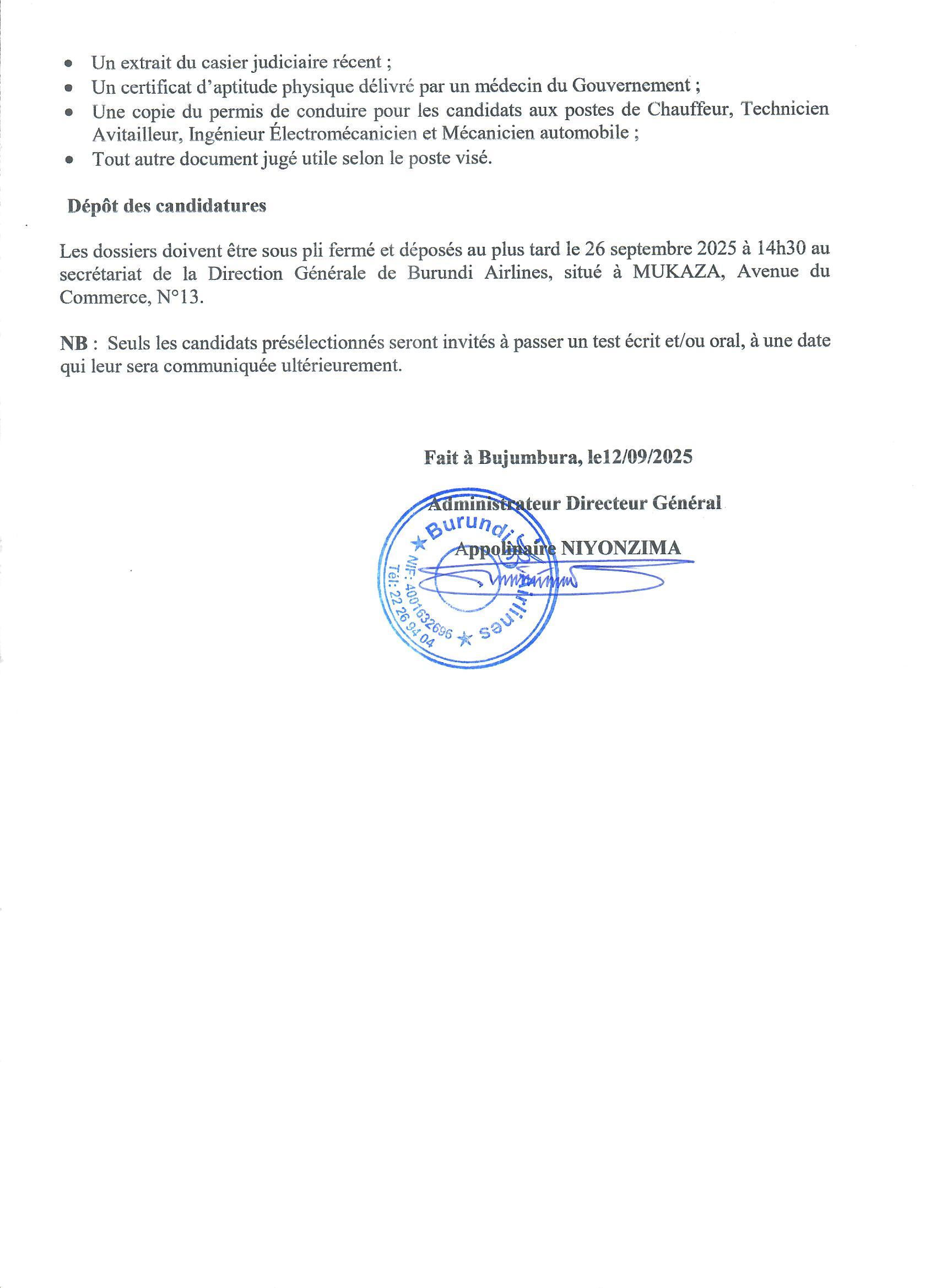 Les dossiers complets de candidature, sous pli fermé, doivent parvenir au secrétariat de la Direction Générale de Burundi Airlines, sis à MUKAZA, Avenue du Commerce, N° 13 au plus tard le 26 septembre 2025 à 14h30.