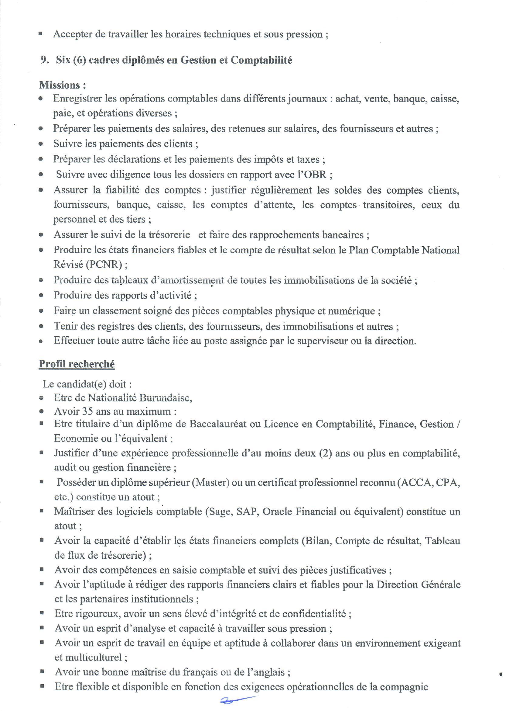 • Deux (2) Cadres de niveau Bac ou licence en gestion, au service facturation ;